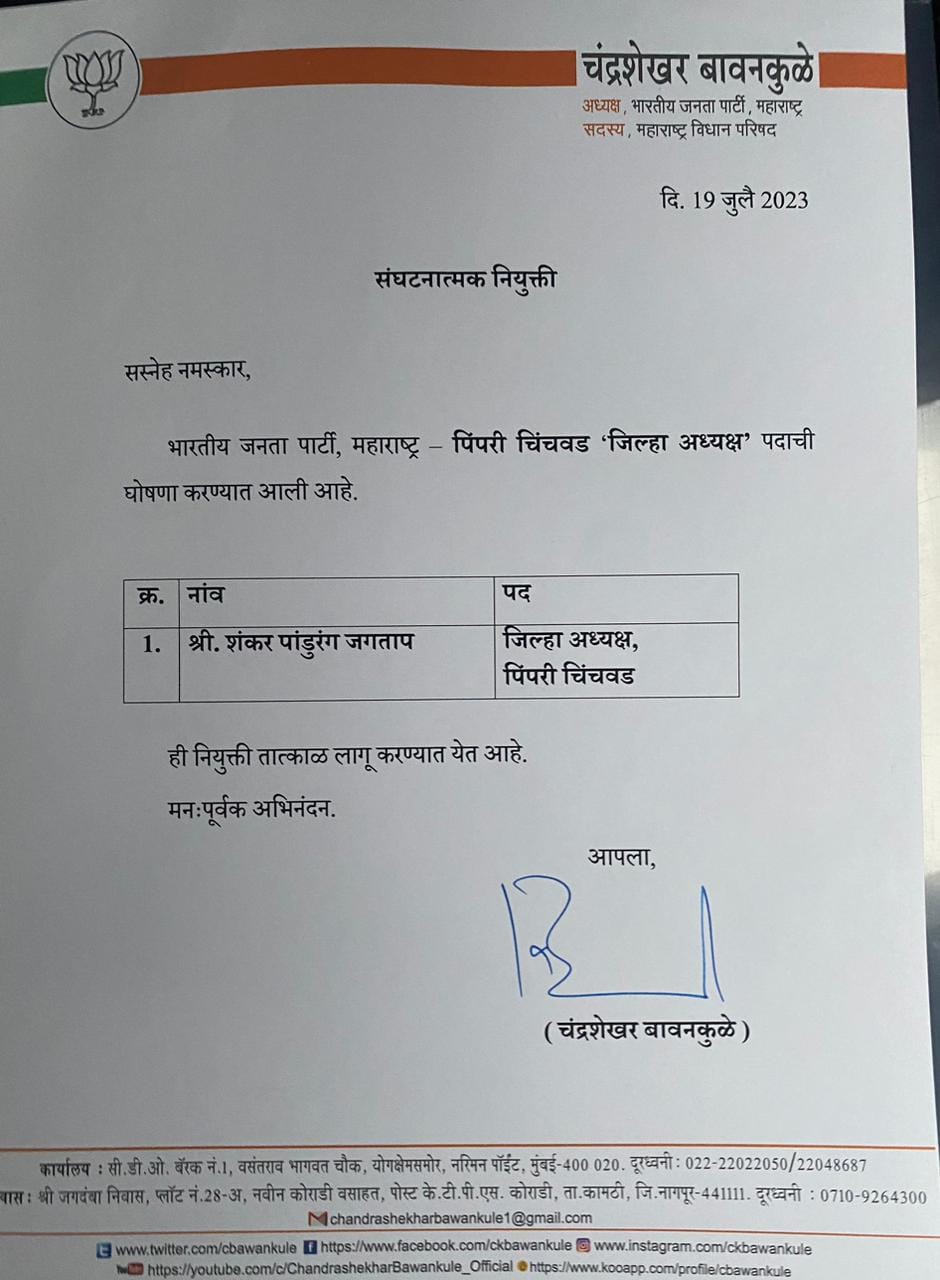 ‘‘भारतीय जनता पार्टी, पिंपरी-चिंचवड शहराध्यक्षपदी नियुक्ती झाल्यानंतर आज महाराष्ट्र भाजपा प्रदेशाध्यक्ष मा.चंद्रशेखरजी बावनकुळे यांच्याहस्ते नियुक्तीपत्र मुंबई येथे स्वीकारले